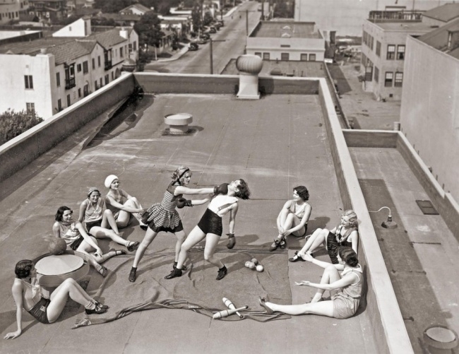 Mulheres lutando boxe em um telhado, Los Angeles, EUA, 1933